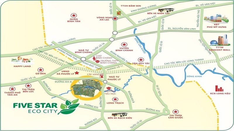 Five Star Eco City – Thành Phố Sinh Thái Năm Sao tọa lạc ngay khu dân cư hiện hữu, vị trí chiến lược trên đường đinh đức thiện – BÌNH CHÁNH, cách trung tâm thành phố 18km và dễ dàng kết nối với những tiện ích thương mại, hành chính và khu vui chơi giải trí qua các đại lộ chính như: Đại lộ Nguyễn Văn Linh, Võ Văn Kiệt, Quốc lộ 1A và Cao tốc Bến Lức – Dầu Giây. Với vị trí đặt biệt khu đất cao, hình chiếc lá được thiên nhiên ban tặng có diện tích 420ha, Five Star Eco City là môi trường sống hoàn hảo, tràng ngập sắc xanh của thiên nhiên hòa quyện cùng không khí trong lành, mát mẻ bốn mùa nhờ kết nối với các nhánh sông Vàm Cỏ Đông. Đây sẽ là nơi lý tưởng để trải nghiệm cuộc sống thanh bình, hạnh phúc bên gia đình; là vị trí VÀNG đầu tư cho tương lai vững chắc, nơi mà cuộc sống và sự nghiệp được thăng hoa đến đỉnh cao.